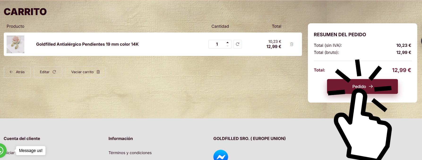 4. En la página del carrito, haga clic en el botón de realizar pedido para continuar.
